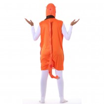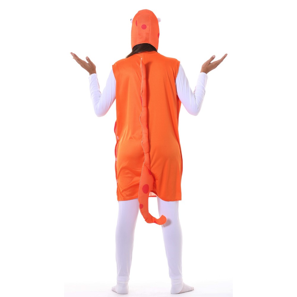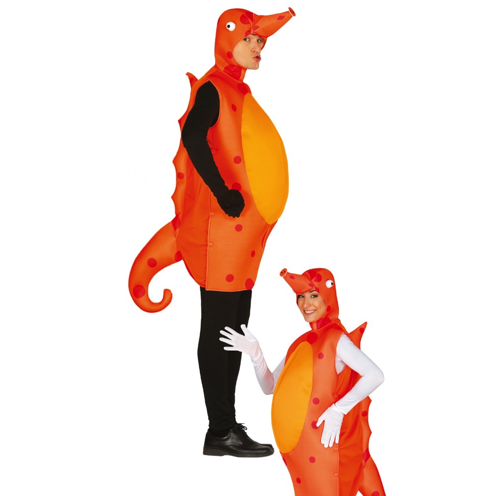 Réf. : ART-079530 Déguisement adulte d'hippocampe comprenant la tunique à capuche avec la queue, sans manches ni bas. Le costume est orange avec des pois rouges et un gros ventre jaune. La cagoule représente la tête du cheval de mer avec sa trompe. Un aileron dorsal et une queue se trouve à l'arrière de la tenue. Idéal afin d'accompagner la petite sirène lors d'une fête à thème ou jouer la mascotte pour animer un rayon poissonnerie.