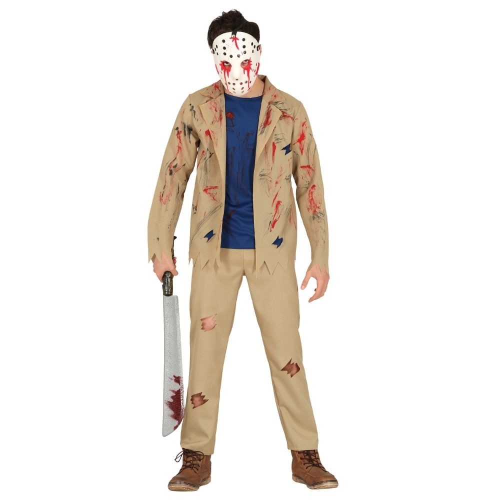 Réf. : ART-084551 Déguisement ado de tueur masqué, inspiré d'un célèbre slasher, pour Halloween ou une soirée frissons. Machette non incluse. Il se compose d'une veste beige déchirée, un pantalon assorti, un t-shirt bleu et un masque de hockey en plastique blanc maculé de sang pour une allure glaçante. Un silence inquiétant, une présence qui glace... Le cauchemar vient de commencer.