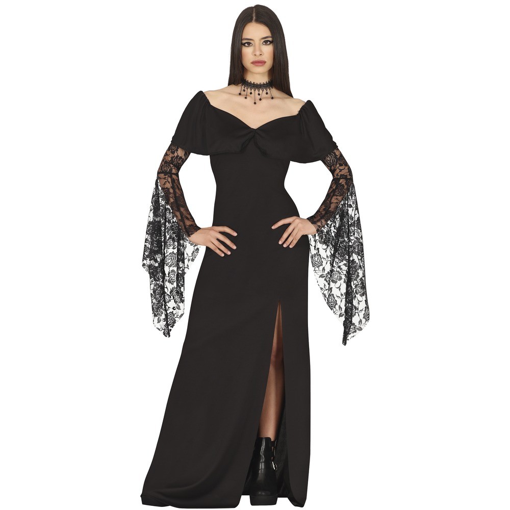 Déguisement ado de matriarche gothique, inspiré du cinéma fantastique, pour un cosplay déroutant. La robe est longue noire fendue avec manches en dentelle dramatique est parfaite pour une allure ténébreuse et envoûtante la nuit d'Halloween ou lors d'une soirée sorcière glamour. Incarnez l'élégance sombre et imposez votre règne avec panache.