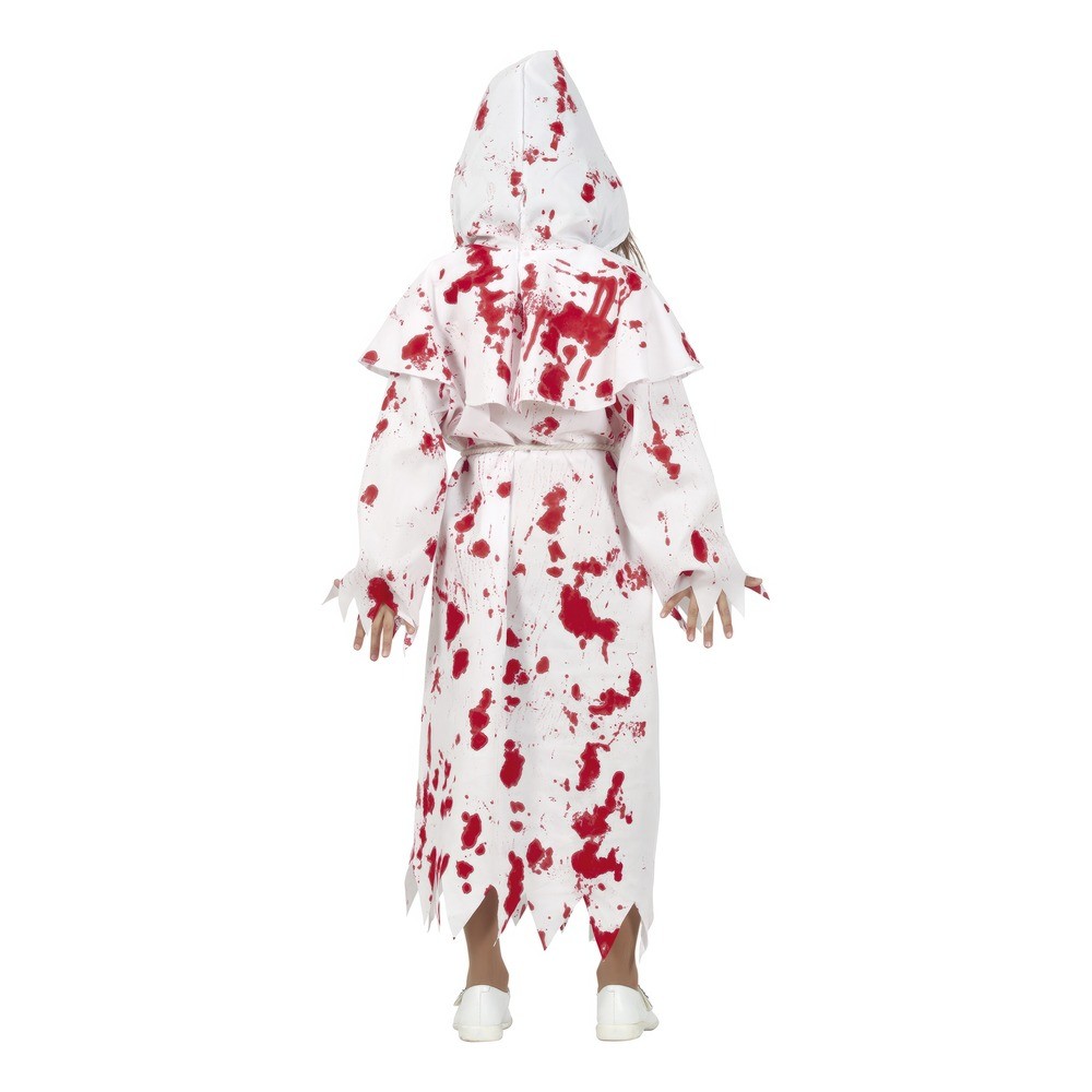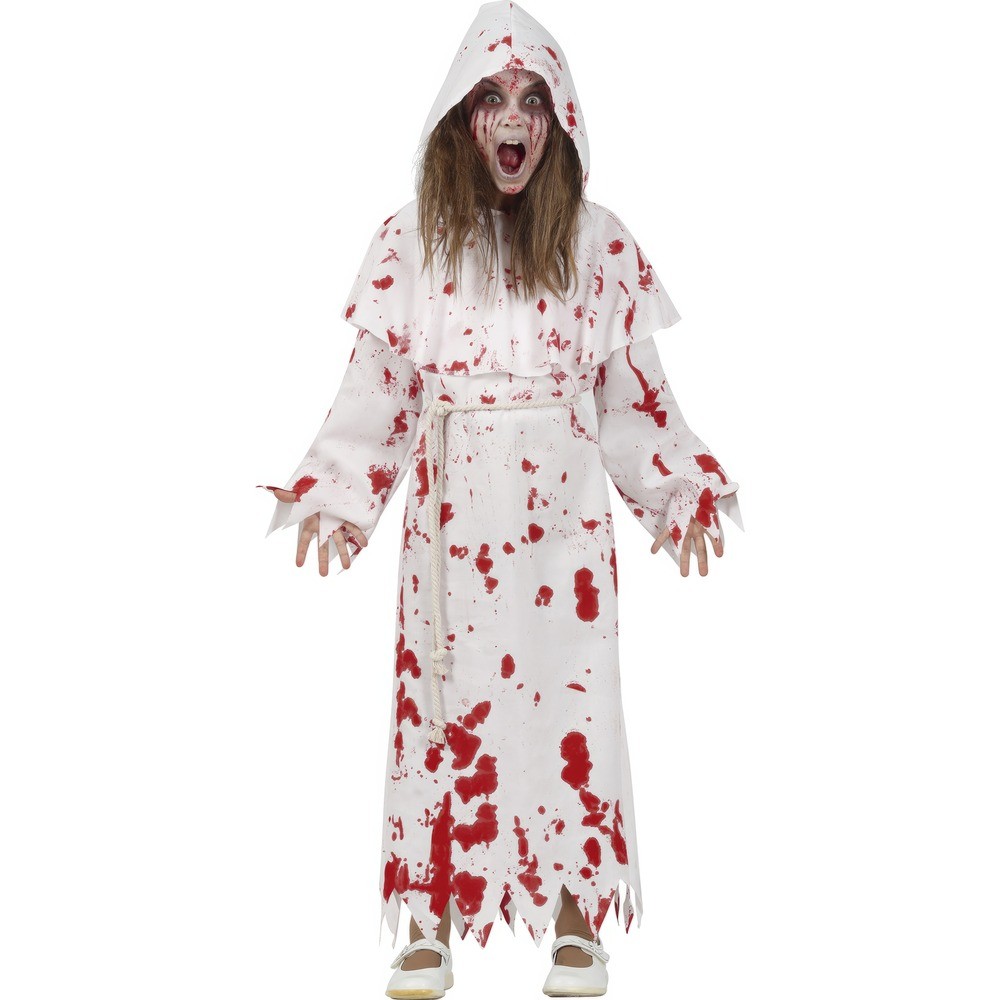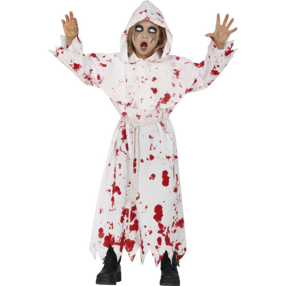 Réf. : ART-084559 Déguisement terrifiant de moine pour enfant, composé d'une tunique à capuche ensanglanté et d'une ceinture corde, pour la nuit Halloween. Avec sa robe blanche tachée de sang, sa capuche inquiétante et ses bords déchirés, ce costume promet une apparition glaçante. Parfait pour hanter les rues le soir d'Halloween et semer la terreur dans les ombres.
