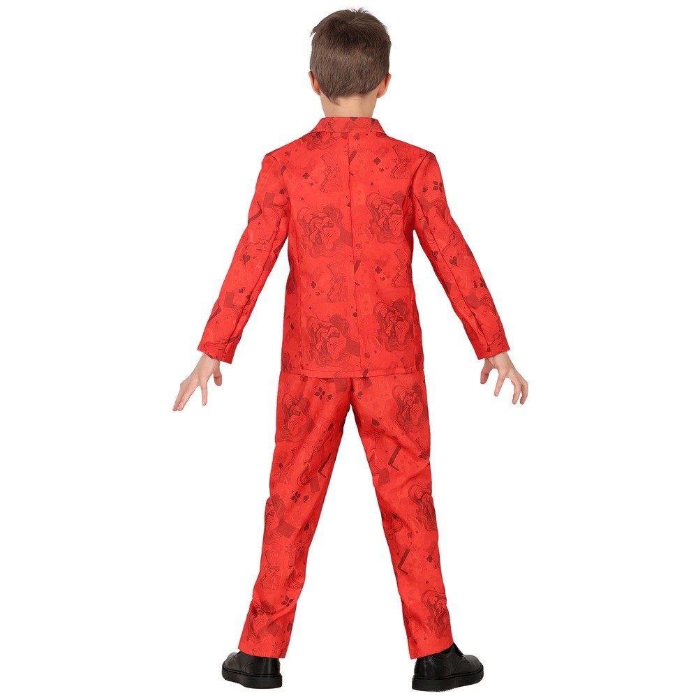 Réf. : ART-084562 Déguisement Mr Smile garçon composé d'une veste, d'un pantalon et d'une cravate rouge pour un cosplay la nuit d'Halloween ou lors d'une fête à thème Cinéma. Chemise non incluse. L'ensemble affiche un imprimé visages d'un célèbre super vilain et jeu de carte. Ce style de gentleman démoniaque est idéal pour semer le trouble avec élégance. Ce costume mêle style et frisson dans un contraste aussi chic que dérangeant.