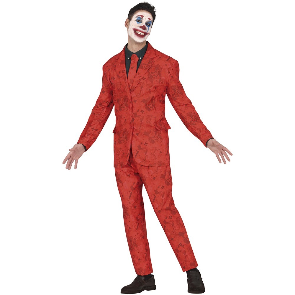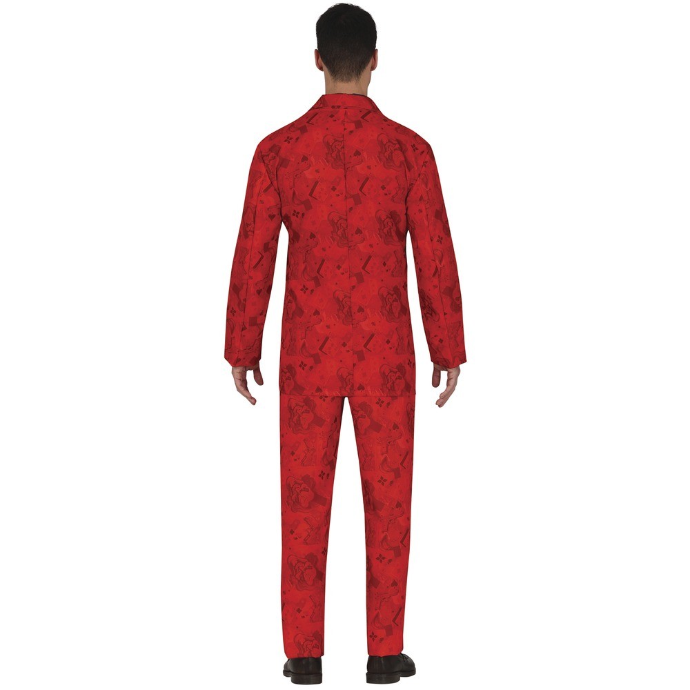 Réf. : ART-084563 Déguisement Mr Smile homme composé d'une veste, d'un pantalon et d'une cravate rouge pour un cosplay la nuit d'Halloween ou lors d'une fête à thème Cinéma. Chemise non incluse. L'ensemble affiche un imprimé visages d'un célèbre super vilain et jeu de carte. Ce style de gentleman démoniaque est idéal pour semer le trouble avec élégance. Ce costume mêle style et frisson dans un contraste aussi chic que dérangeant.