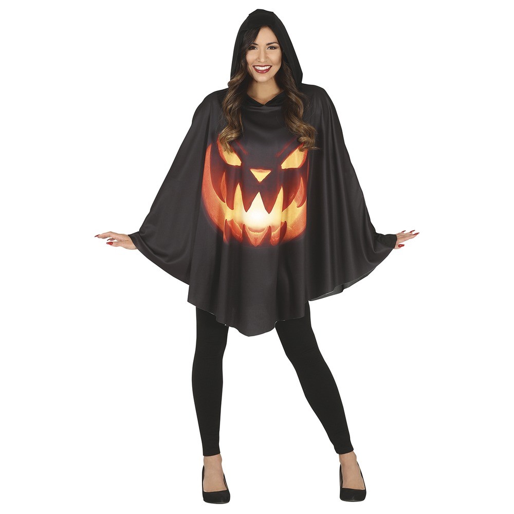 Réf. : ART-084567 Déguisement poncho citrouille terrifiante pour femme, avec capuche noire et imprimé d'une lanterne maléfique aux yeux ardents, pour la nuit d'Halloween. Legging non inclus. Vous incarnez l'esprit grinçant des nuits d'automne. Facile à porter, léger et effrayant à souhait. Un classique revisité pour hanter les rues avec style.