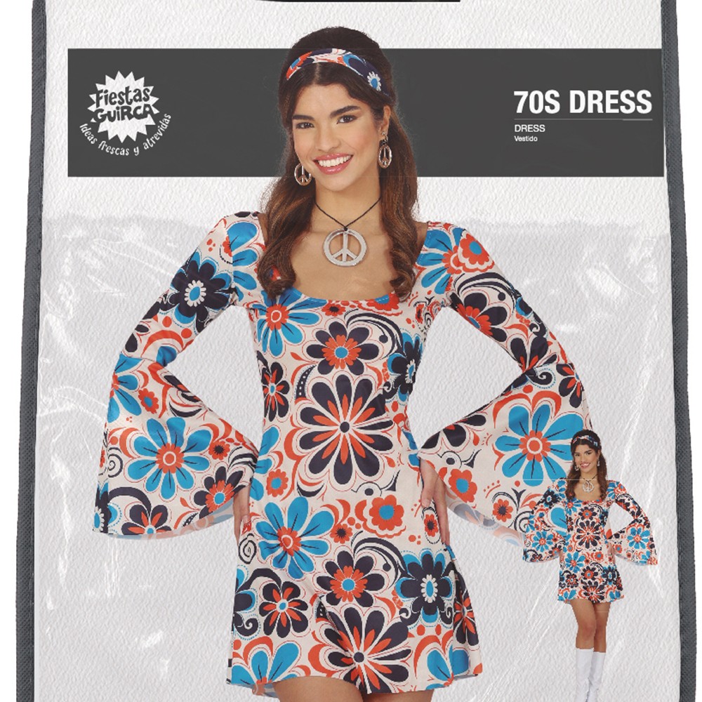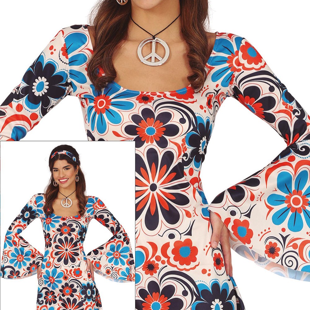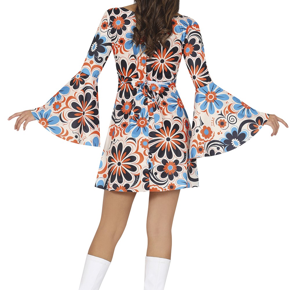 Réf. : ART-083697 Déguisement comportant une robe et un bandeau, crème avec imprimé floral bleu et orange, pour une fête à thème Hippie ou le Carnaval. Les bijoux fantaisies et les bottes ne sont pas inclus. Avec ses manches longues évasées et son décolleté arrondi, ce vêtement incarne à merveille la quintessence de l'amour et de la liberté qui ont défini cette décennie magique. La coupe vous enveloppe dans le confort et le style.