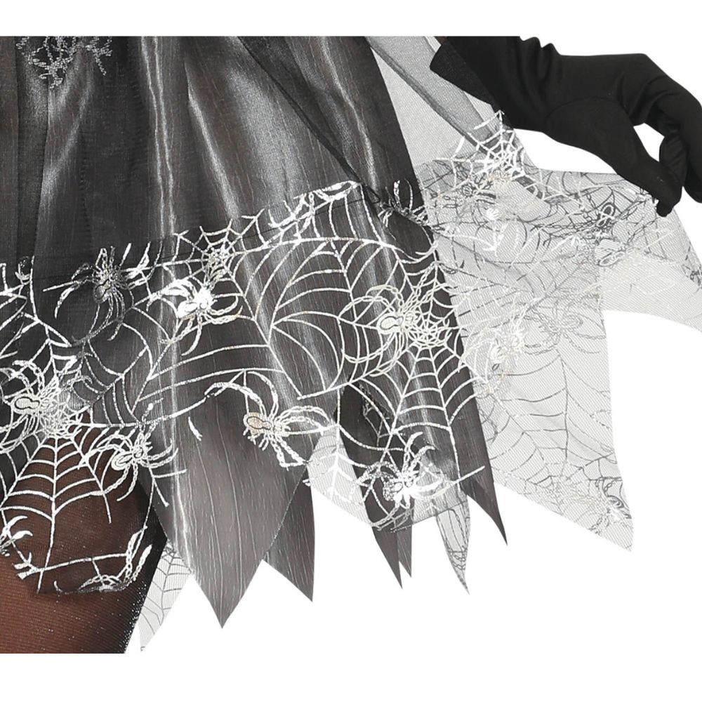 Réf. : ART-084579 Déguisement de sorcière pour femme, comprenant la robe et le chapeau, pour Halloween. Gants et collants non inclus. La robe est courte noire et grise aux reflets métalliques, rehaussée d'un tulle imprimé de toiles d'araignée scintillantes. Les épaules et le jupon sont décorés de volants transparents pour un effet envoûtant. Le grand chapeau pointu assorti complète cette tenue digne des plus grandes ensorceleuses.