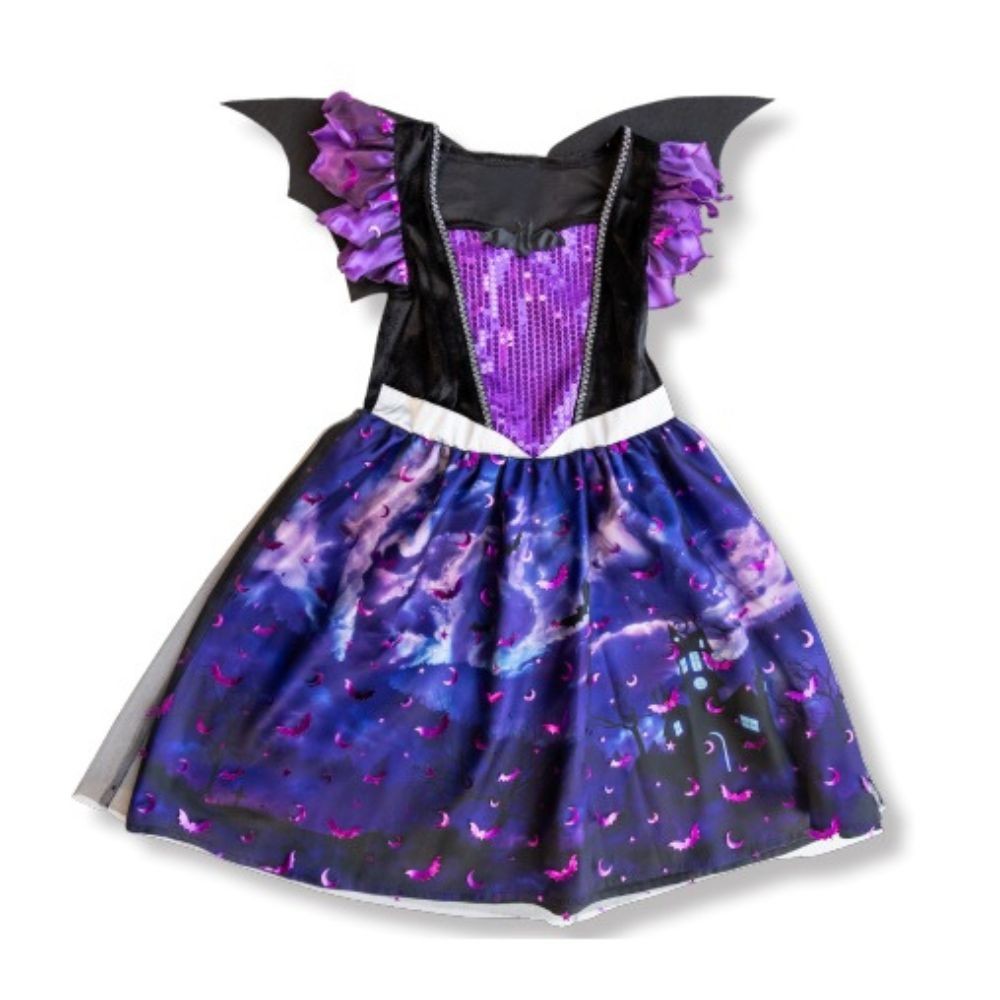 Réf. : ART-084170 Déguisement sorcière chauve-souris violet pour fille, comprenant une robe avec ailes, afin de plonger dans l'univers d'Halloween. La robe scintille de mystère avec ses teintes violettes et son ciel nuageux peuplé de chauves-souris, tandis que les ailes ajoutent une touche de magie sombre. Idéal pour un sortilège nocturne ou une envolée fantastique sous la lune. Costume envoûtant pour jeune sorcière intrépide.
