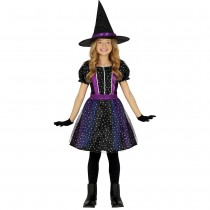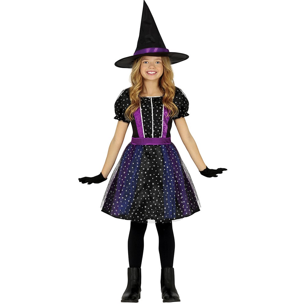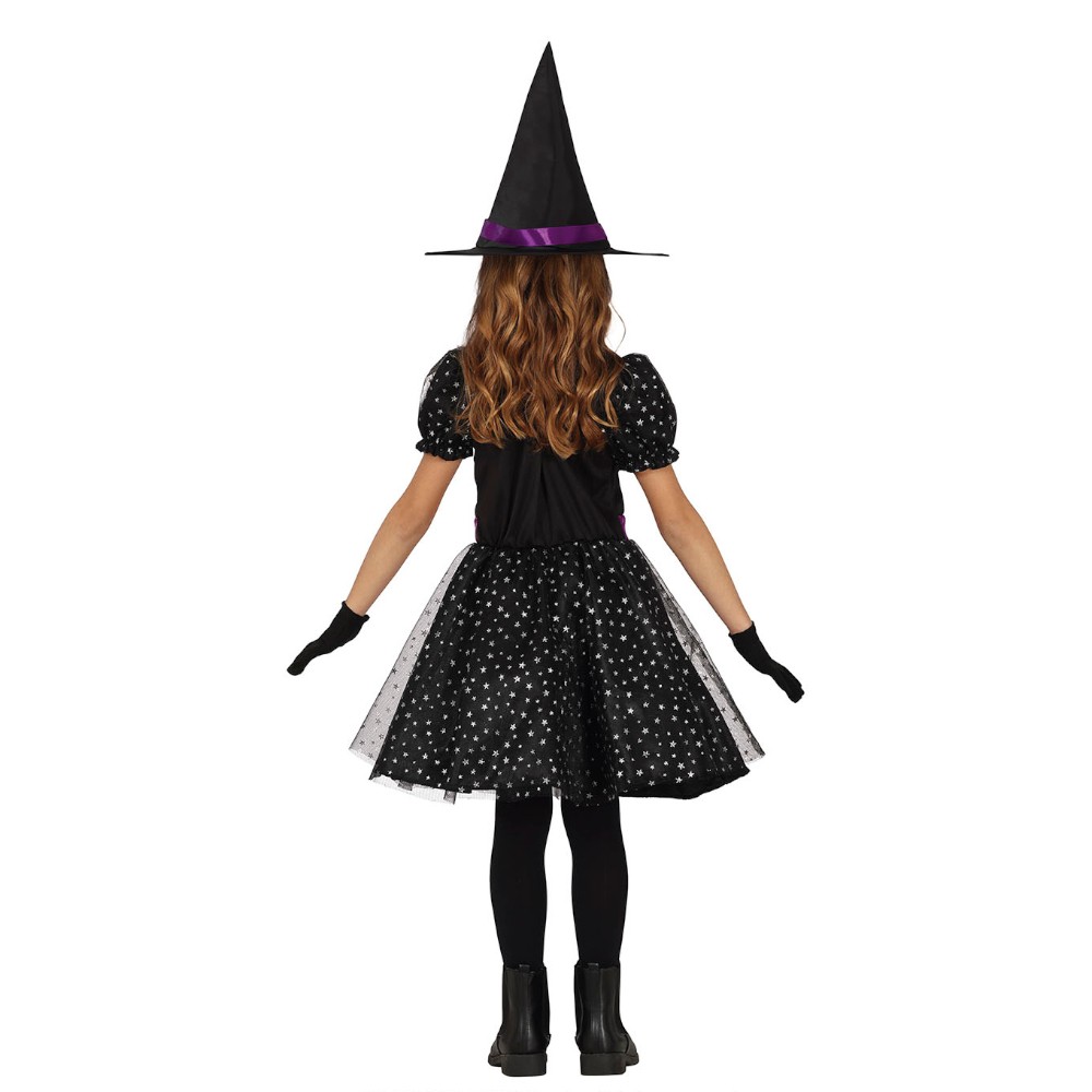 Réf. : ART-077073 Déguisement de sorcière mystique pour fille, comprenant la robe et le chapeau pointu. Paire de gants et collants non inclus. Les manches sont courtes et bouffantes. Des motifs étoiles ornent le costume. Des sequins sont cousus au niveau du buste. La partie jupe est doublée avec du tulle. Les bandes satinées violettes évoquent le mystère et l'ésotérisme. La tenue est parfaite pour entrer dans la peau d'une magicienne maléfique la nuit d'Halloween.