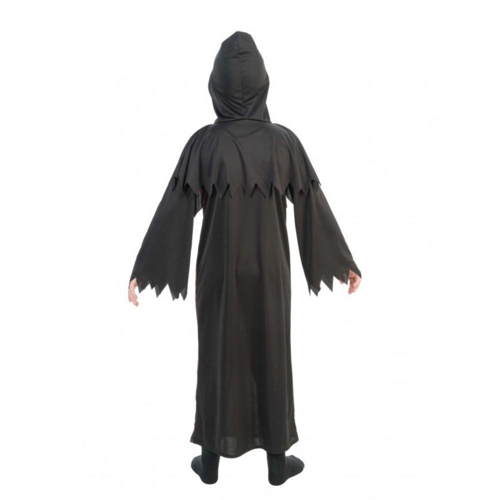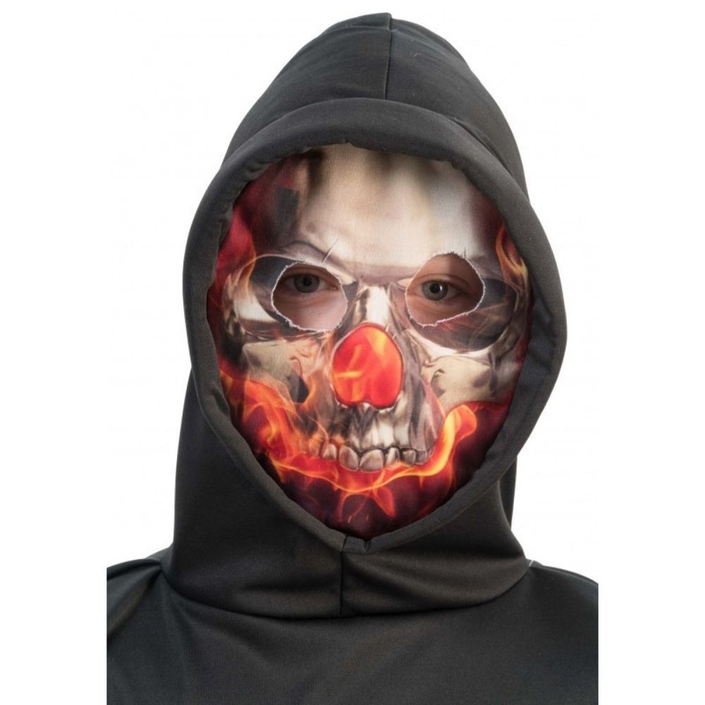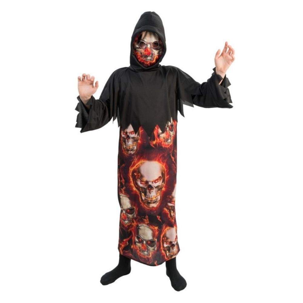 Réf. : ART-084104 Déguisement d'esprit infernal enfant, comprenant la robe et le masque, pour la nuit d'Halloween. Ce costume de l'horreur plonge droit en enfer avec son imprimé spectaculaire : des crânes enflammés aux regards perçants surgissent d'un tourbillon de flammes rougeoyantes, comme prisonniers d'un brasier éternel. Le haut noir à manches évasées dentelées évoque une silhouette spectrale, tandis que le masque assorti renforcent le look satanique.
