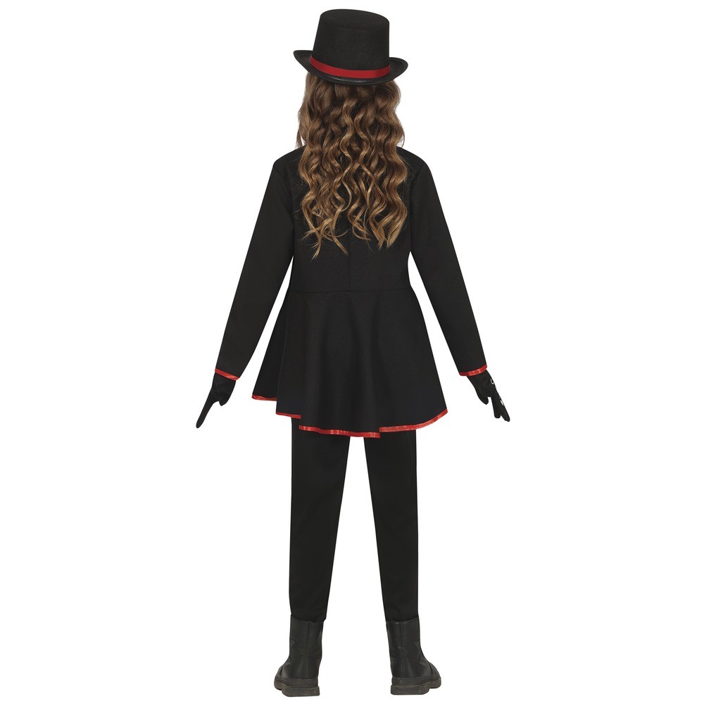 Réf. : ART-084592 Déguisement de squelette dandy pour fille, comprenant une veste noire cintrée à revers rouges, une combinaison noire ornée d'un squelette blanc, et un chapeau haut-de-forme assorti pour un look effroyablement élégant. Sceptre non inclus. Ce costume évoque un maître des ténèbres, entre cérémonie macabre et style victorien. Idéal pour un Halloween raffiné... et terrifiant.