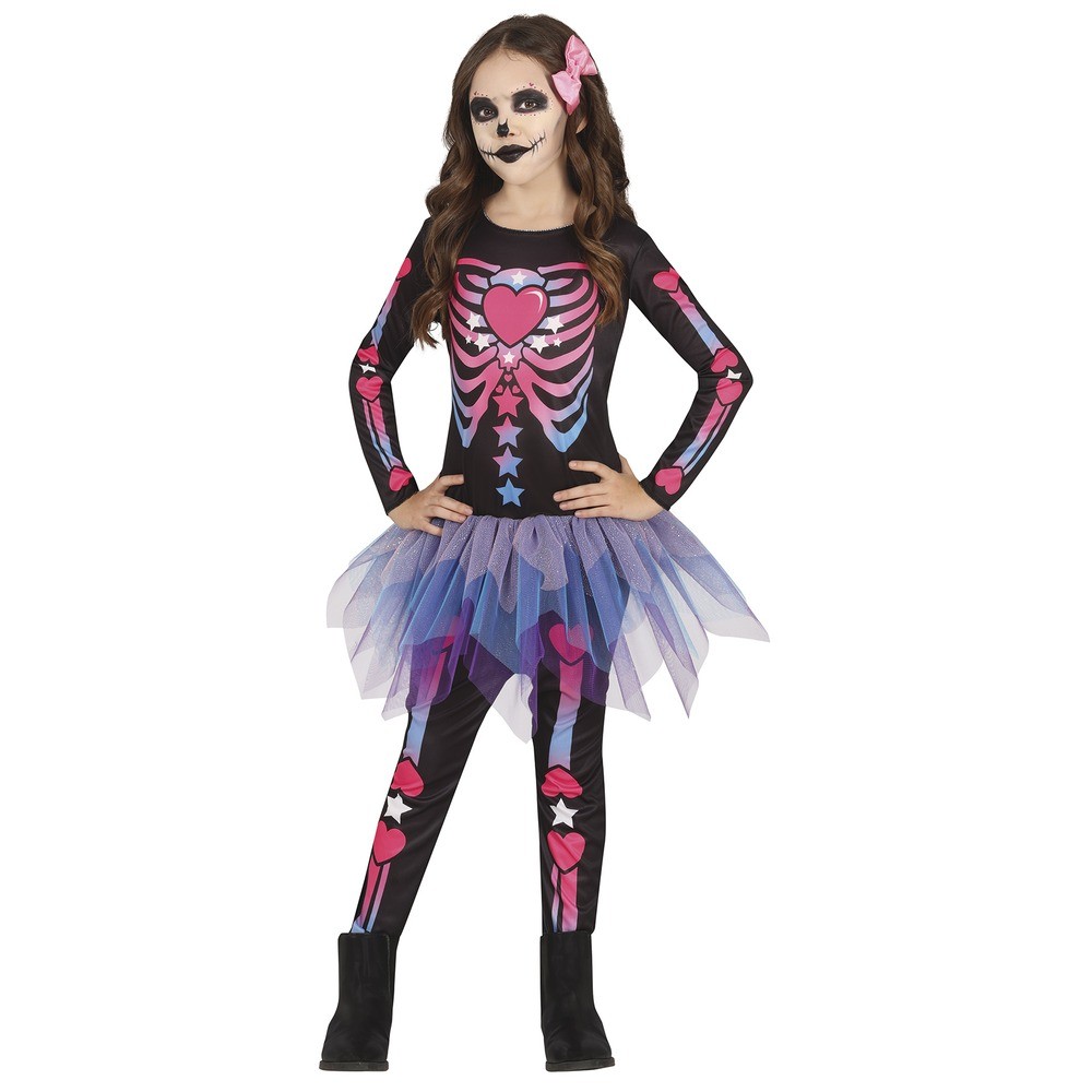 Déguisement de squelette cœur rose pour fille, composé d'une combinaison noire à imprimés osseux dans des tons roses et violets avec des cœurs et des étoiles, et d'un tutu en tulle avec dégradé de couleurs pour un look fun et effrayant à la fois. Nœud à cheveux non inclus. Idéal pour Halloween avec une touche girly originale.