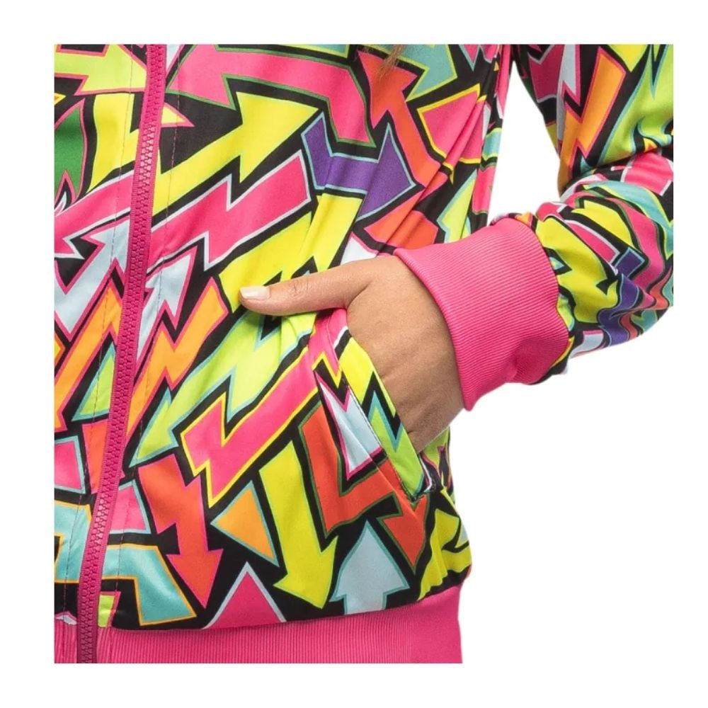 Réf. : ART-085895 Déguisement survêtement street art fluo pour femme afin d'afficher un style accrocheur lors de festivités. Son imprimé graphique multicolore brille sous lumière UV pour un effet vibrant en soirée. Confortable et pratique grâce à ses poches zippées, il est parfait pour les fêtes à thème, les festivals ou les soirées années 80-90. Original, fun et flashy : un look urbain qui en jette !