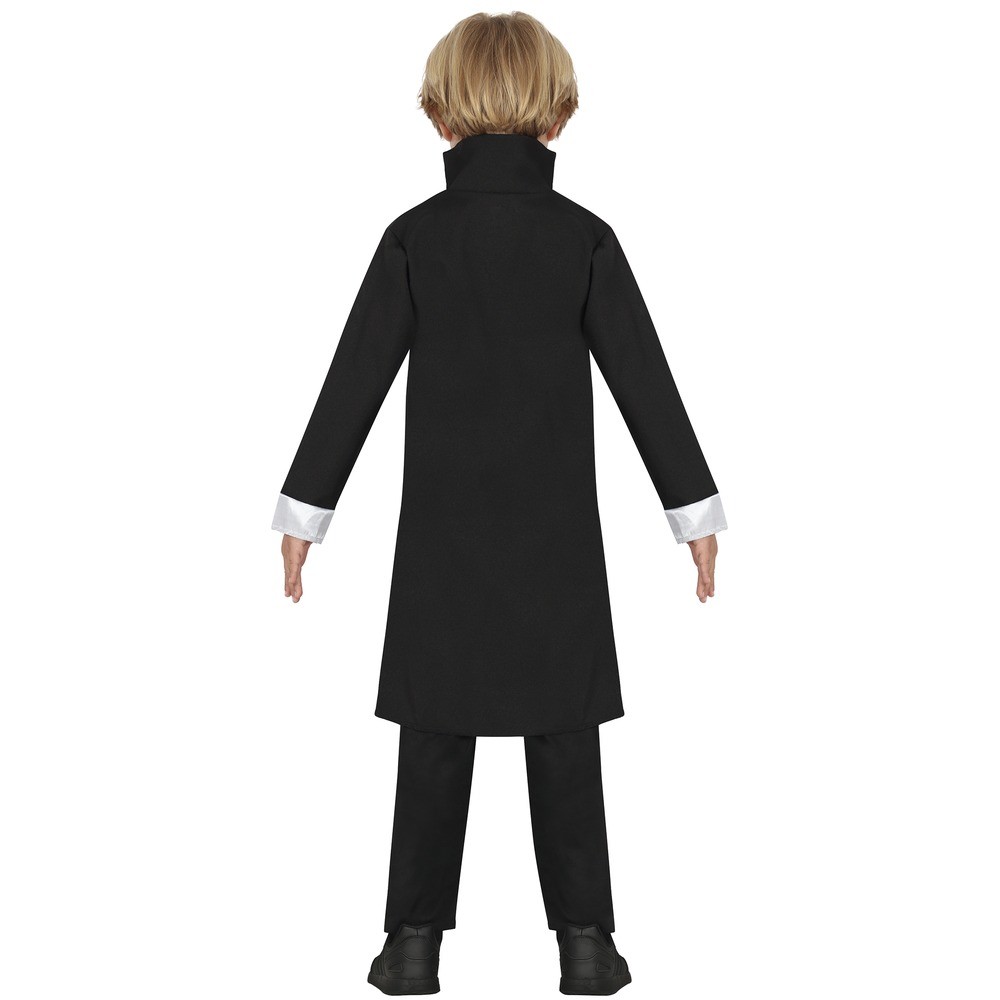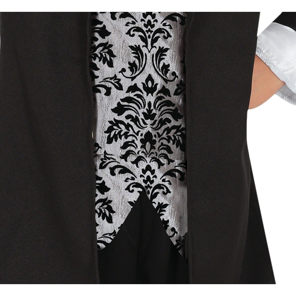 Réf. : ART-084606 Déguisement de vampire baroque garçon, composé d'un long manteau noir à boutons argentés, d'un gilet argent à motif raffiné et d'un col plissé blanc satiné pour un look mêlant élégance et mystère. Canne de marche non incluse. Avec son allure de jeune noble revenu d'outre-tombe, ce costume est parfait pour une nuit d'Halloween sous le signe du raffinement gothique. Il évoque les bals oubliés des châteaux engloutis dans la brume.