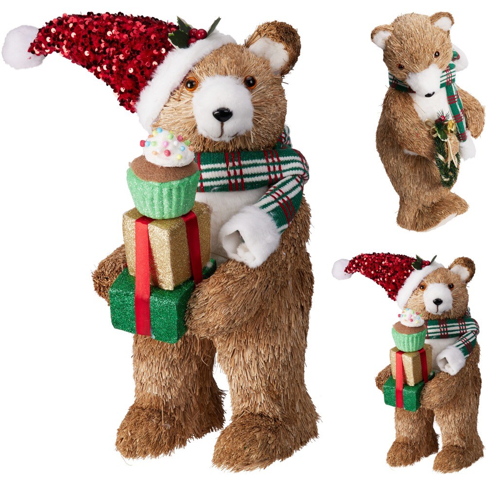 Réf. : ART-085374 Figurine ours brun en polyfoam pour décorer lors des festivités de Noël. Hauteur : 32 cm. Poids : 500 g. Vendu à l'unité. 2 modèles existent (avec cadeau à la main ou couronne), envoi aléatoire en fonction du stock disponible. Son allure attendrissante et festive apporte chaleur et fantaisie. Parfait à poser près du sapin ou sur une console pour créer une ambiance joyeuse et magique.