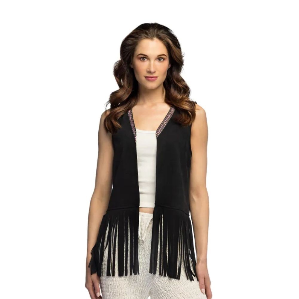 Réf. : ART-085890 Gilet bohème en suédine noire à franges pour femme afin d'affirmer votre style libre et décontracté. Doux et fluide, il évoque l'esprit hippie chic des années 70. Sa coupe ouverte et ses détails frangés subliment une tenue simple avec une touche vintage. Idéal pour un festival, une soirée à thème ou un look boho du quotidien, il complète à merveille jeans, jupes ou robes légères.