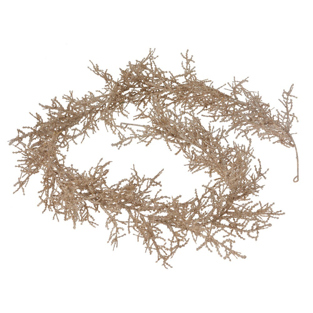 Réf. : ART-085396 Guirlande de pin artificiel en polyéthylène, couleur champagne foncé pailletée, pour décorer. Dimensions : 150 x 5 x 5 cm. Composée de 120 pointes, elle brille de mille feux pour sublimer rampes, cheminées ou tables festives. Idéale pour une décoration de Noël élégante et scintillante.