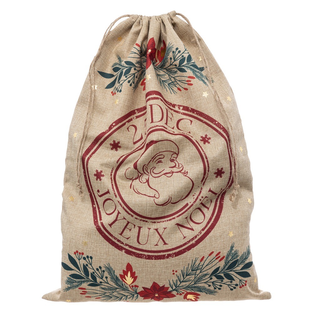 Réf. : ART-084861 Hotte du Père Noël en toile imprimée, décorée de feuillages et poinsettias aux accents rouge et vert traditionnels pour la distribution des surprises. Dimensions : 50 x 70 cm. Avec son illustration rétro et son message Joyeux Noël, elle évoque l'arrivée magique du Père Noël. À glisser au pied du sapin, remplie de cadeaux, pour faire briller les yeux des petits comme des grands.