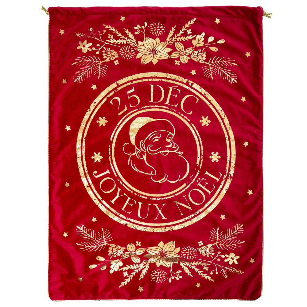 Réf. : ART-084860 Hotte du Père Noël en tissu rouge, ornée d'un message doré et du visage joyeux du célèbre bonhomme à barbe blanche, pour glisser les cadeaux et ajouter une touche de magie. Dimensions : 50 x 70 cm. Elle transforme chaque présent en trésor venu tout droit du pôle Nord. À poser au pied du sapin pour un effet wahou garanti au matin de Noël.