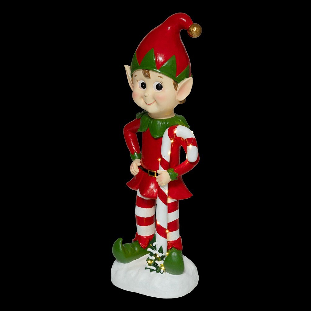 Réf. : ART-084833 Statue décorative en magnésie représentant un lutin espiègle vêtu de rouge et blanc, inspiré des sucres d'orge de Noël. Hauteur : 90 cm. Parfait pour apporter une touche de magie et d'émerveillement à vos intérieurs comme à vos vitrines de fête. Ce lutin lumineux fonctionne à piles et diffuse une ambiance chaleureuse grâce à son éclairage LED intégré. Fonctionne avec 3 piles LR6 AA (non incluses).