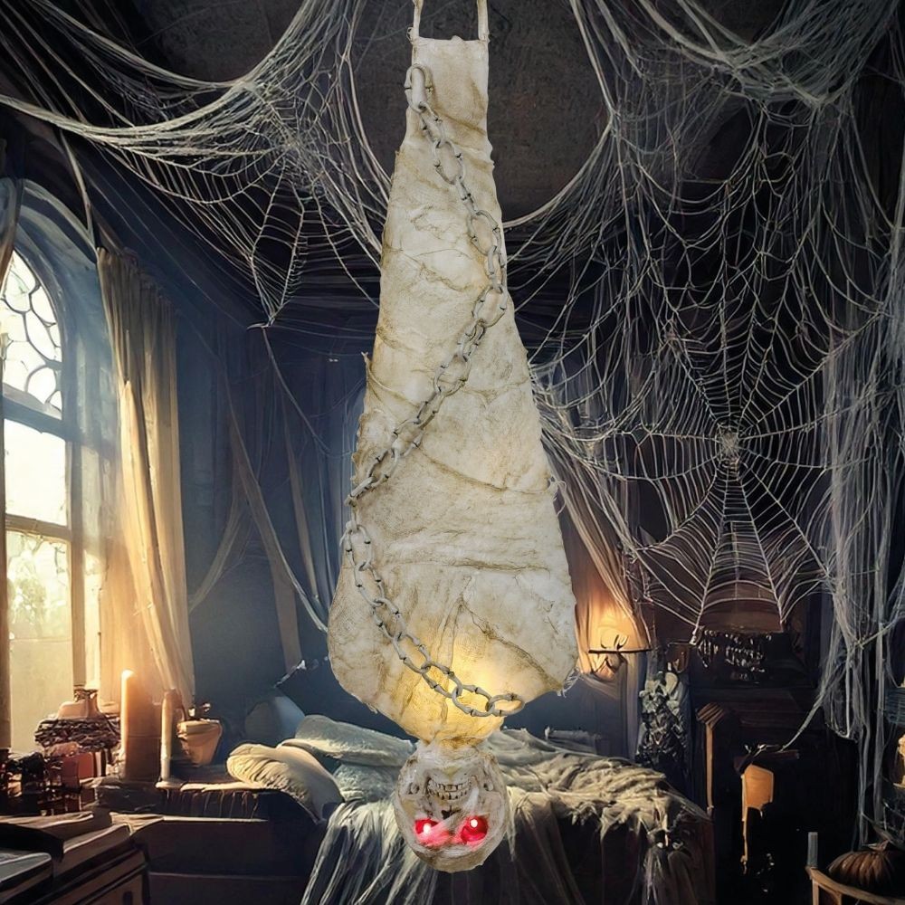 Réf. : ART-084370 Momie lumineuse décorative, à suspendre pour éveiller les ténèbres la nuit d'Halloween. Longueur : 75 cm. Piles non incluses. Ses yeux rouges brillent dans l'ombre, créant une ambiance macabre et envoûtante. Enveloppée dans un linceul jauni, elle semble surgir d'un cauchemar oublié. Idéale pour une décoration glaçante et immersive. Comprend un retardateur de flamme pour plus de sécurité.