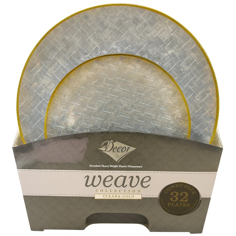 Pack composé de 32 assiettes réutilisables en plastique transparent avec une bordure dorée. 16 assiettes de 26 cm et 16 assiettes de 19cm type dessert. L'assiette a un aspect tressé au relief original, ce qui donne à votre table de réveillon ou de cérémonie un look unique.