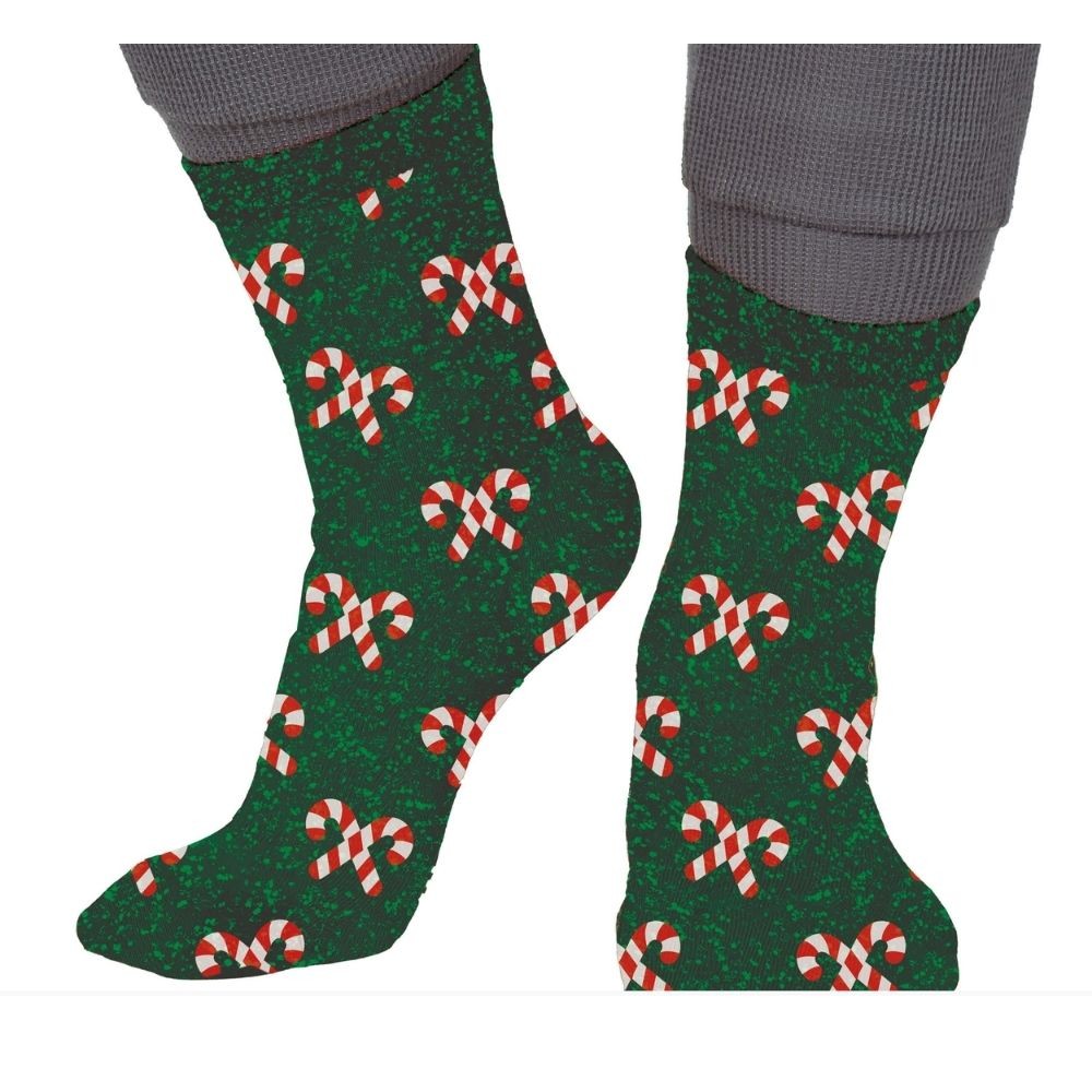 Réf. : ART-085689 Paire de chaussettes vertes ornées de délicieux sucres d'orge afin d'ajouter une touche gourmande durant les fêtes. Douces, chaudes et pleines d'esprit de Noël, elles allient confort et fantaisie pour réchauffer vos pieds tout l'hiver. Parfaites pour cocooner au coin du feu ou compléter une tenue de Noël amusante et colorée.