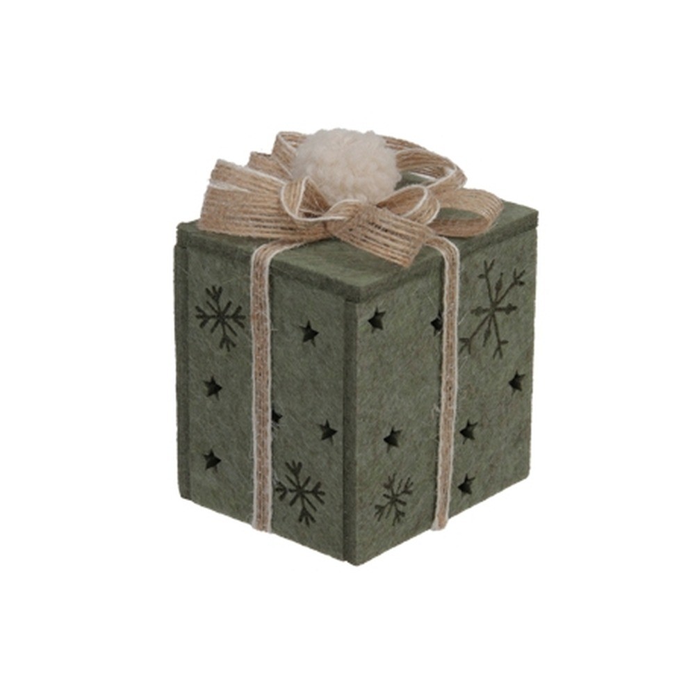 Réf. : ART-084707 Boîte cadeau suspendue en feutrine verte pour une touche féerique et végétale à votre décoration de Noël. Dimensions : 8 x 7 x 11,5 cm. Habillée d'un ruban de jute et de motifs ajourés en forme d'étoiles, elle capte la lumière avec délicatesse. Suspendue à une branche ou au sapin, elle insuffle un esprit nature et authentique à votre ambiance festive.