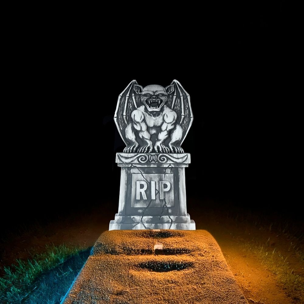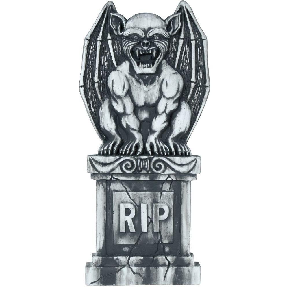 Réf. : ART-084403 Pierre tombale surmonté d'une gargouille redoutable, en polystyrène imitation pierre, pour la décoration d'Halloween. Dimensions : 90 x 40 cm. Sur la stèle est écrit RIP. Elle transforme instantanément votre jardin ou votre intérieur en cimetière maudit. Un gardien effrayant pour une déco d'Halloween mémorable.