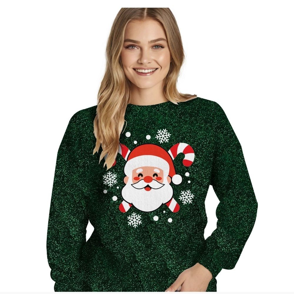 Réf. : ART-085697 Pull vert forêt scintillant, orné d'un joyeux Père Noël entouré de flocons et de cannes à sucre, pour faire briller votre esprit de fête. Son look pailleté capte la lumière pour un effet irrésistible. Doux et confortable, il est parfait pour illuminer vos soirées de Noël avec humour, chaleur et une touche de magie.