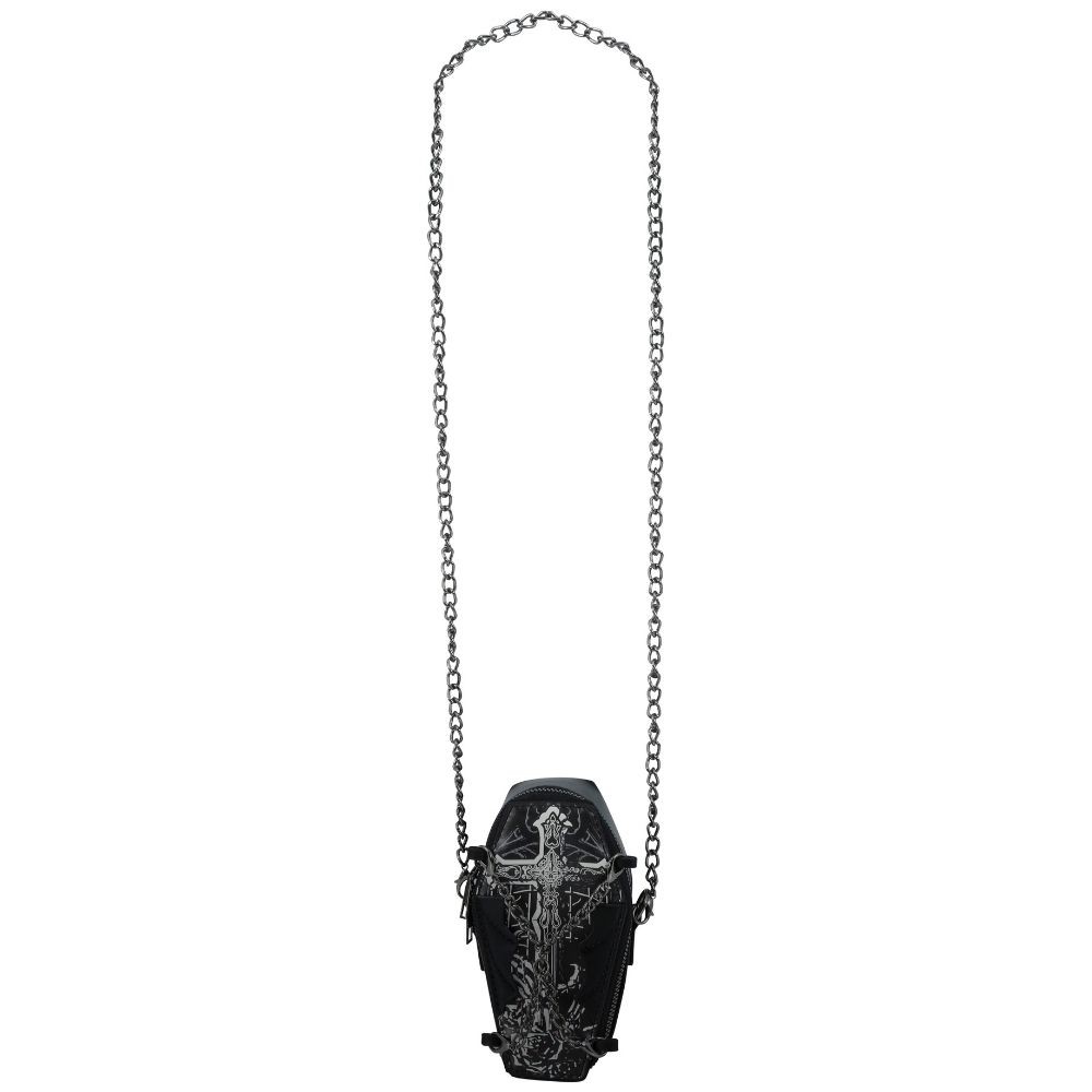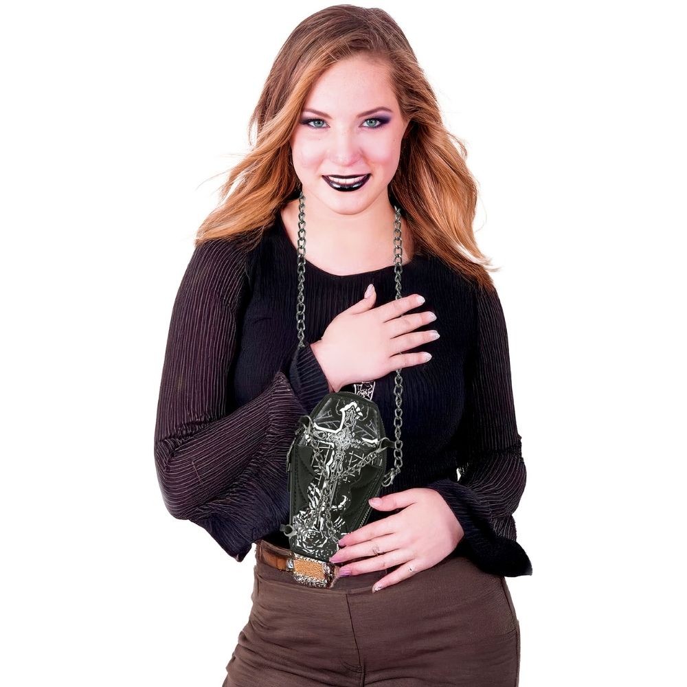 Réf. : ART-084422 Sac cercueil gothique en similicuir noir pour ajouter une touche macabre à votre look. Dimensions : 17 x 10 cm. Orné d'une croix argentée et de chaînes métalliques, il incarne le style dark. Utile pour conserver près de soi ses affaires personnelles tout en gardant l'esprit de la fête. Sa bandoulière chaîne et son format compact en font l'accessoire idéal pour parfaire un look Halloween, steampunk ou rock.