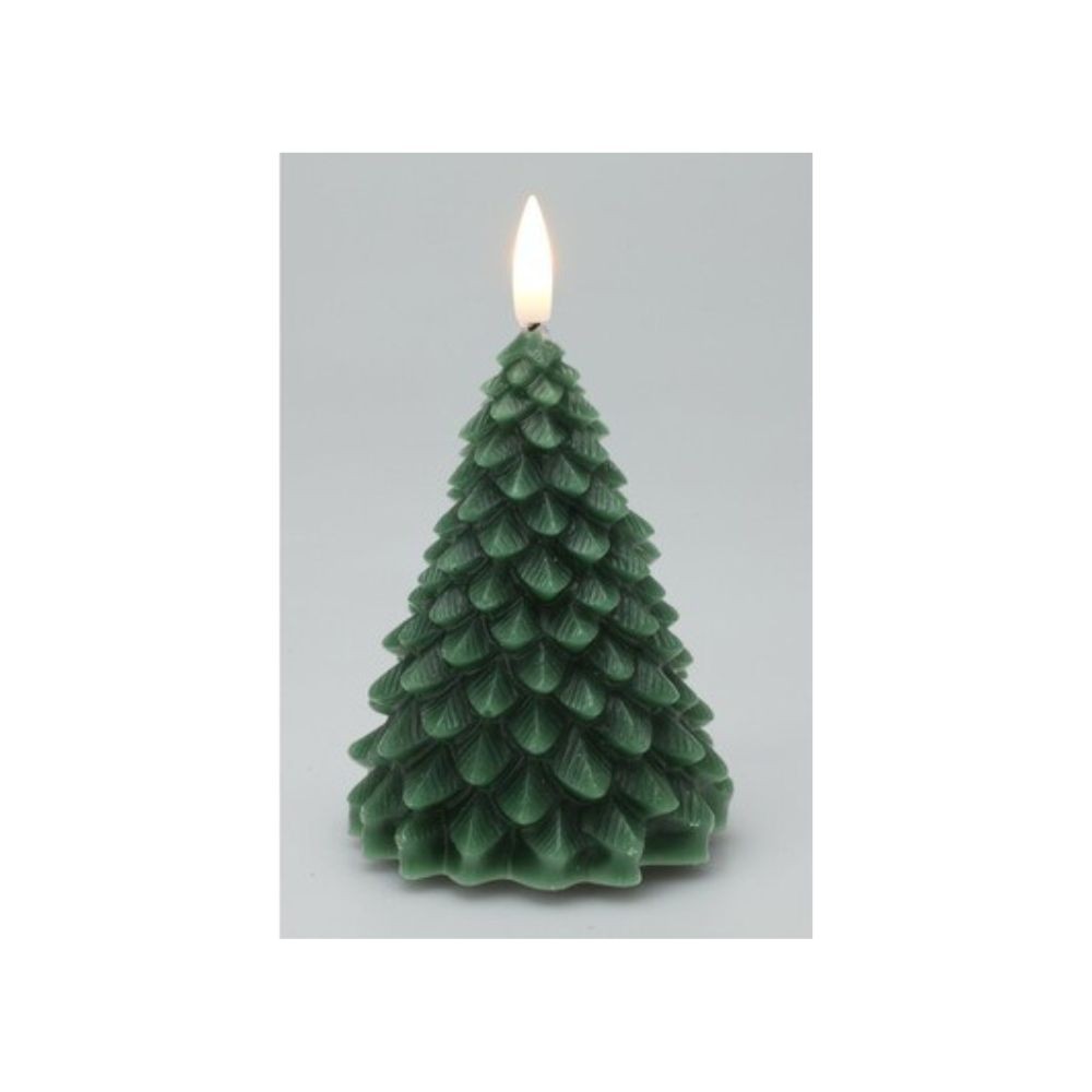 Réf. : ART-085455 La bougie LED en forme de sapin vert foncé illumine vos fêtes d'un éclat apaisant et naturel. Dimensions : 11 x 8 cm. Vendu à l'unité. La lumière blanc chaud est idéale pour diffuser une ambiance féerique. Sculptée en cire, elle s'intègre parfaitement à une déco hivernale. Fonctionne avec 2 piles AAA (non incluses). Équipée d'une fonction minuterie pour programmer l'éclairage à la période souhaité durant 6h maximum.