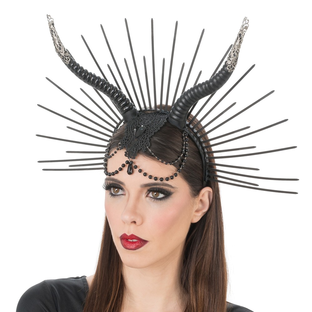 Réf. : ART-084071 Serre-tête gothique spectaculaire afin de couronner votre look d'un éclat ténébreux. Dimensions : 42 x 3 x 30 cm. Orné de longues pointes noires, de cornes majestueuses aux détails argentés et d'une parure de perles noires tombant délicatement sur le front, il incarne la puissance et le mystère. Idéal pour un costume de sorcière, reine des ténèbres ou déesse maléfique, il promet un effet théâtral inoubliable.