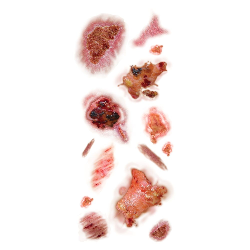 Réf. : ART-084468 Tatouages éphémères représentant des stigmates de blessures ouvertes infectées, à appliquer en décalcomanie directement sur la peau. Sélection de plaies, écorchures et brûlures purulentes pour compléter un maquillage d'Halloween, un costume de zombie ou de victime de l'apocalypse. Nul besoin de se torturer, ces tatouages temporaires réalistes sont parfaits pour un effet spectaculaire et rapide la nuit d'Halloween.