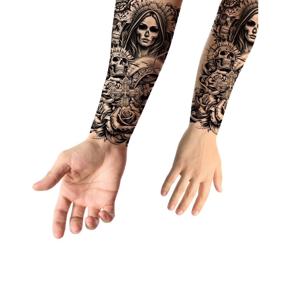 Réf. : ART-084470 Tatouages éphémères inspirés de l'iconique Catrina pour plonger dans l'univers mystique du Día de los Muertos. Un chef-d'?"uvre en noir et blanc mêlant têtes de mort, roses, croix et ornements sacrés dans un style mexicain riche et détaillé. Effet manche complète pour un look spectaculaire, parfait pour Halloween, spectacles ou festivals gothiques. Un hommage à la mort tout en beauté.