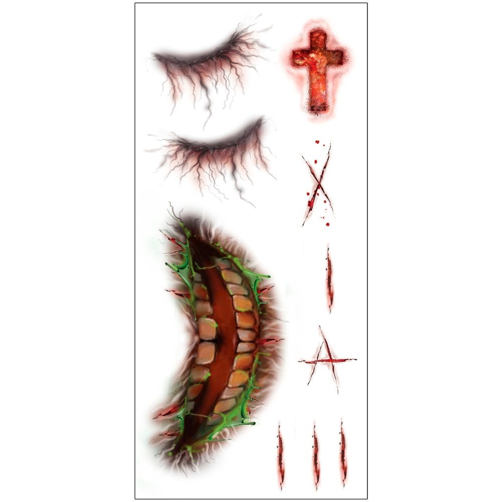 Réf. : ART-084474 Tatouages éphémères horrifiques effet zombie pour transformer votre look. Cicatrices sanglantes, croix incrustée, veines apparentes et bouche déchirée effet putréfié pour créer l'illusion et compléter votre déguisement. Parfait pour jouer un mort-vivant lors de vos soirées déguisées ou escape games d'horreur. Les tatouages s'appliquent grâce au procédé de décalcomanie à l'eau. L'encre cosmétique répond aux normes CE.